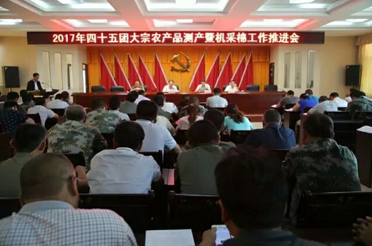 为准确掌握棉花、红枣及其它农产品产量,全力以赴地完成好秋收生产工作,8月20日,四十五团召开2017年大宗农产品测产暨机采棉工作推进会。
